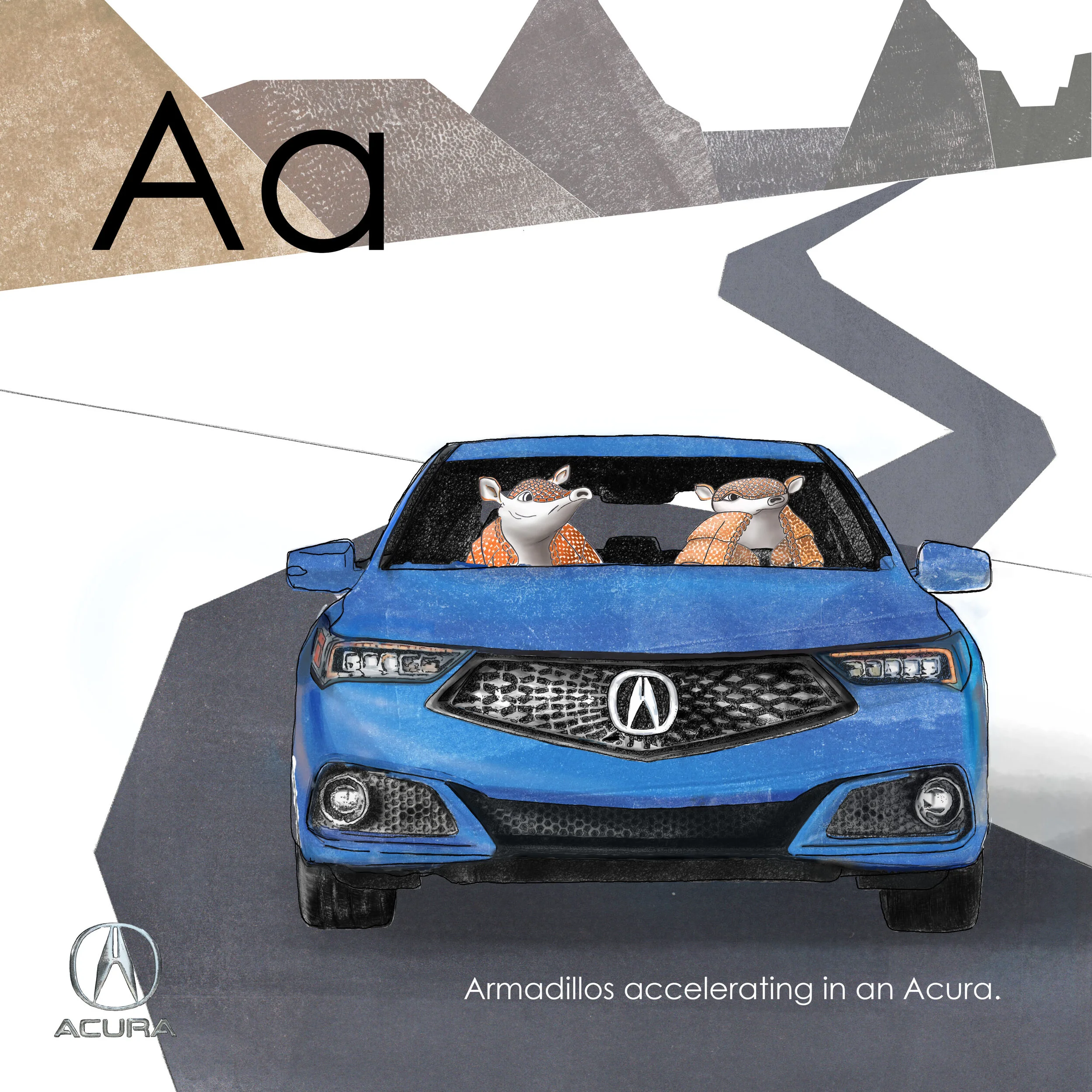 In my digital works I construct narratives for parents to use as educational tools for children, through the use of automobile and animal forms. A is for Acura, is a part of a larger project that has been a vehicle through which to learn digital illustration. It allowed me to study animal anatomy, often mixing human and animal features when creating characters. Though the final product is digital I have used textures created through the printmaking process and I’ve used ink on paper to create the linework for the vehicle. This work is playful and includes bright colors that capture children’s attention.
