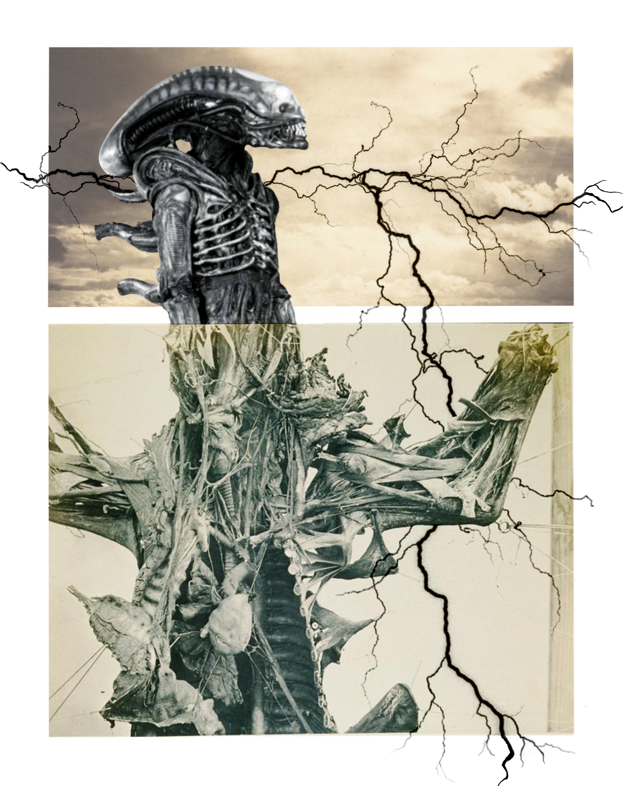 Mason Kupina, The forms of Murder, Steel tray, collage on silk screen, cow vertebrae, 12” x 4” x 16”