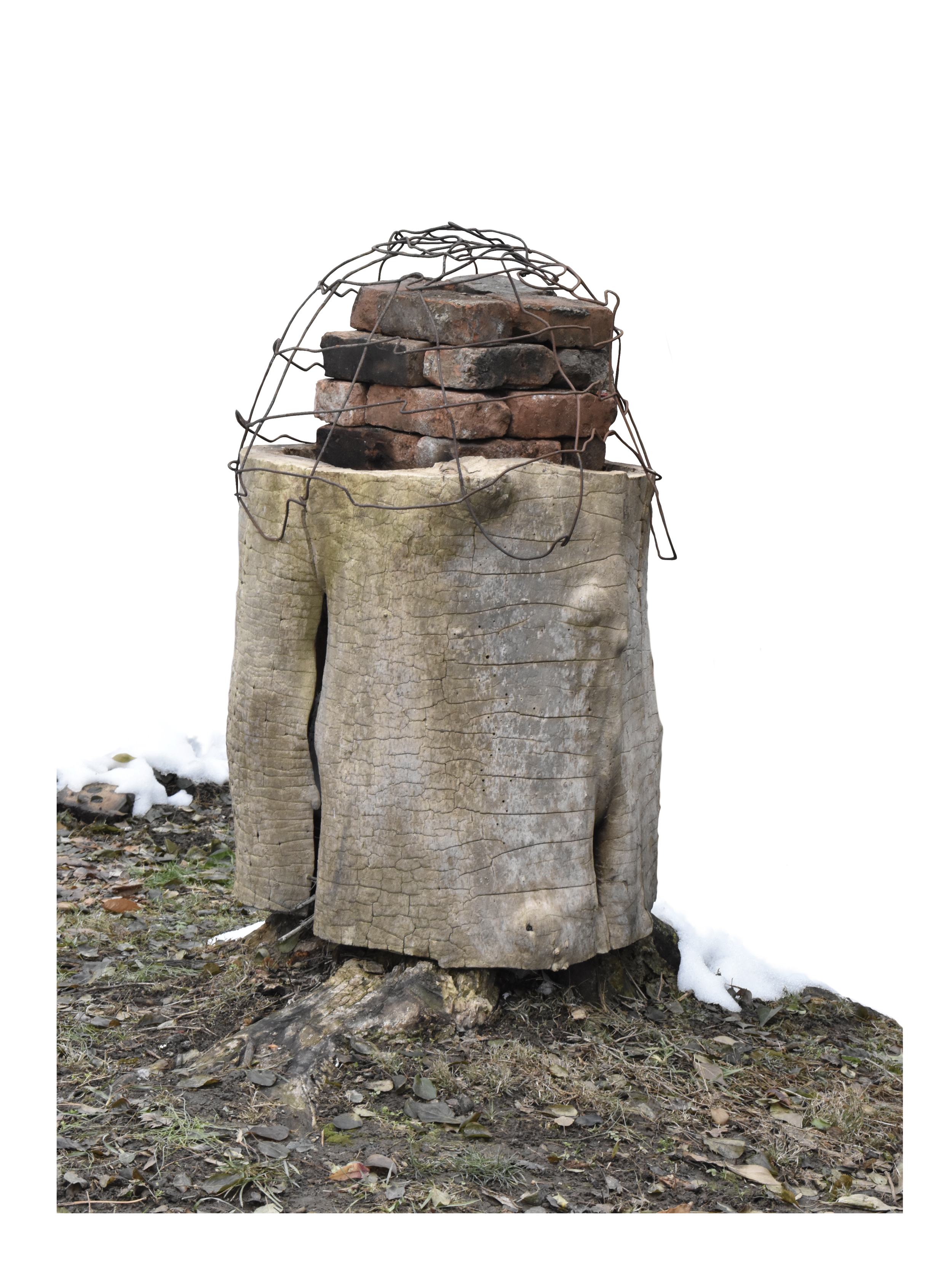 Mason Kupina, Venus, Beech tree trunk, burned bricks, domed cage, 53” x 22”