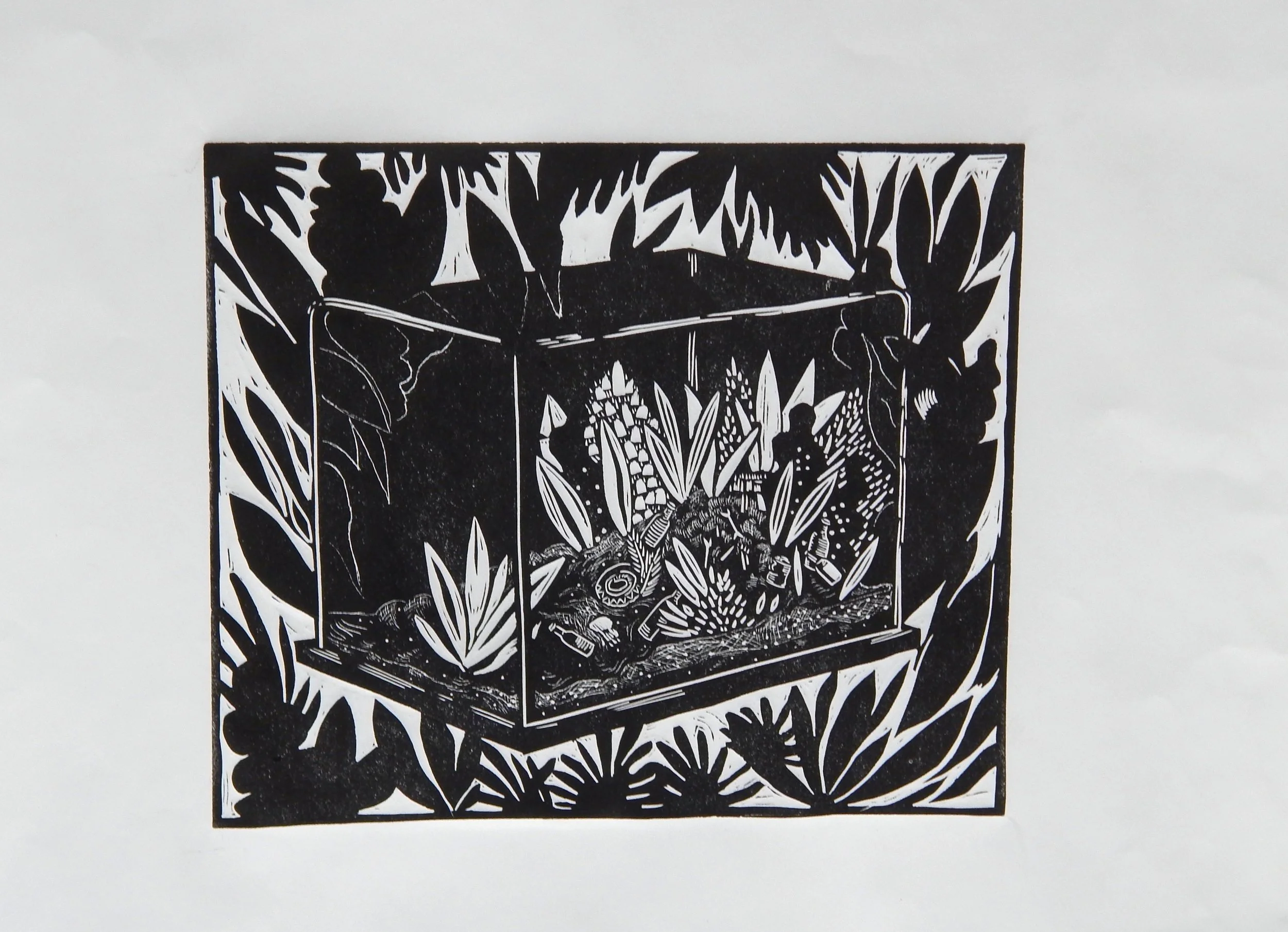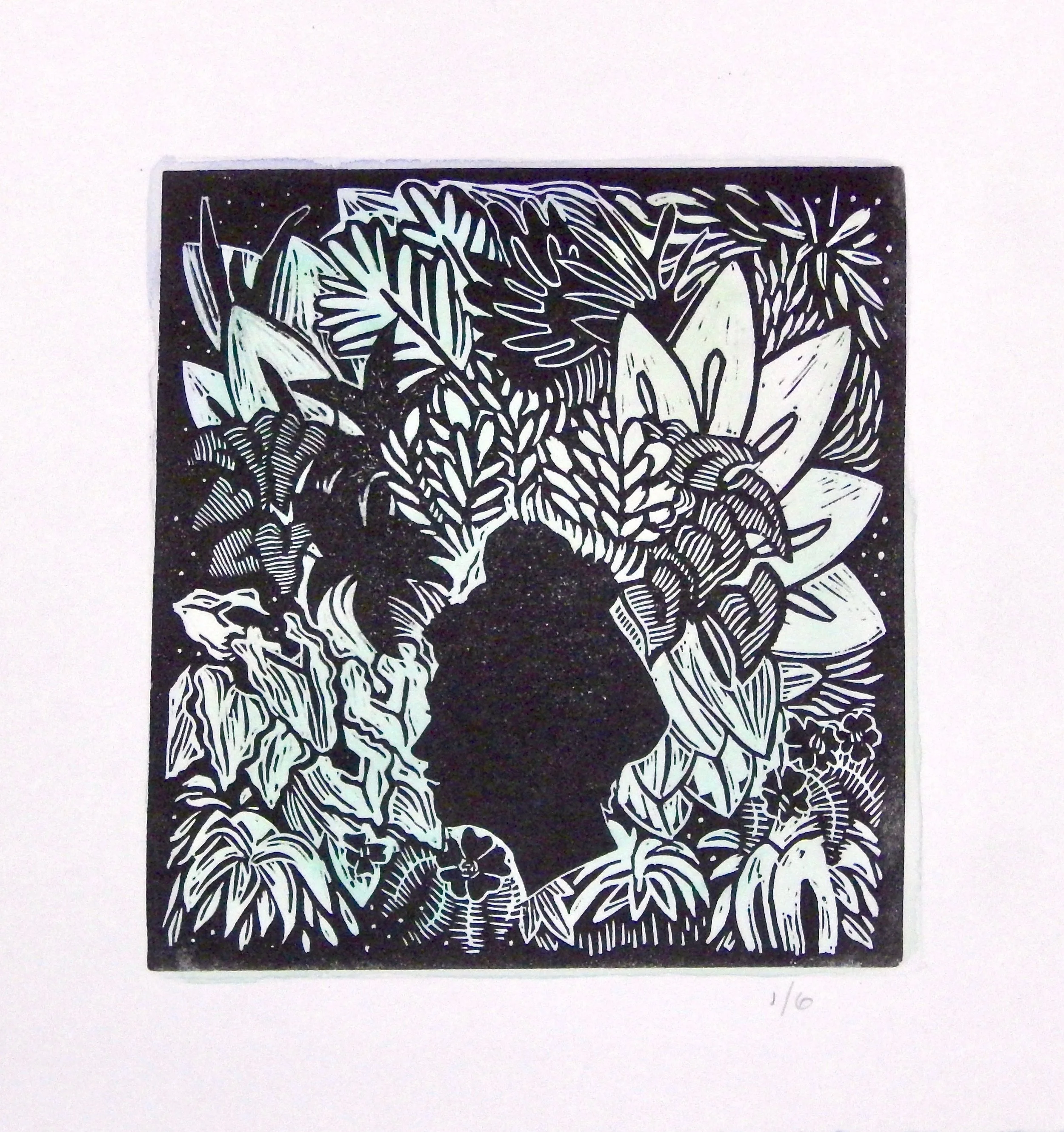 This series of prints are a concentration of my interior psychological state. I am obsessive about death and all its sadness, pain, and loneliness. I am at odds with maintaining a normal state of mind and my depressive compulsions. This leafy environment is representative of the perpetual nature of covering up, unearthing, remembering, and encasing again.